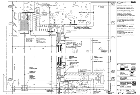 MOM Park Leitdetail: V - Schnitt Sturzanschluss an Naturstein, Bruestungs-anschluss an Blechfassade